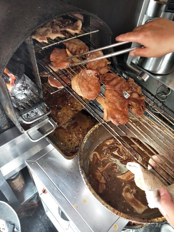 在博義師燒肉飯店門口就可以看到師傅正在用碳火烤燒肉。